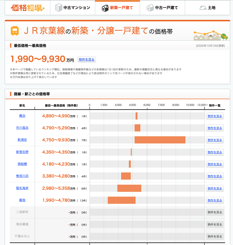 このような感じで表示される。うーんなるほど。同じ路線内でもかなり違うことがわかるし、選んだエリアの金額感もなんとなくわかる。(新浦安ものすごい高いな、とか)