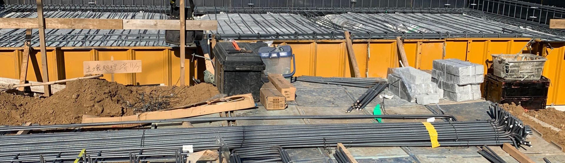 現場にいろいろな物が持ち込まれている。基礎屋さんとも顔馴染みになったので、気軽にいろいろ教えてくれた。鉄筋がたくさんある。クネクネ曲がっている鉄筋は「立ち上がり」というらしい。この立ち上がりに乗せる形で配筋するとのこと。