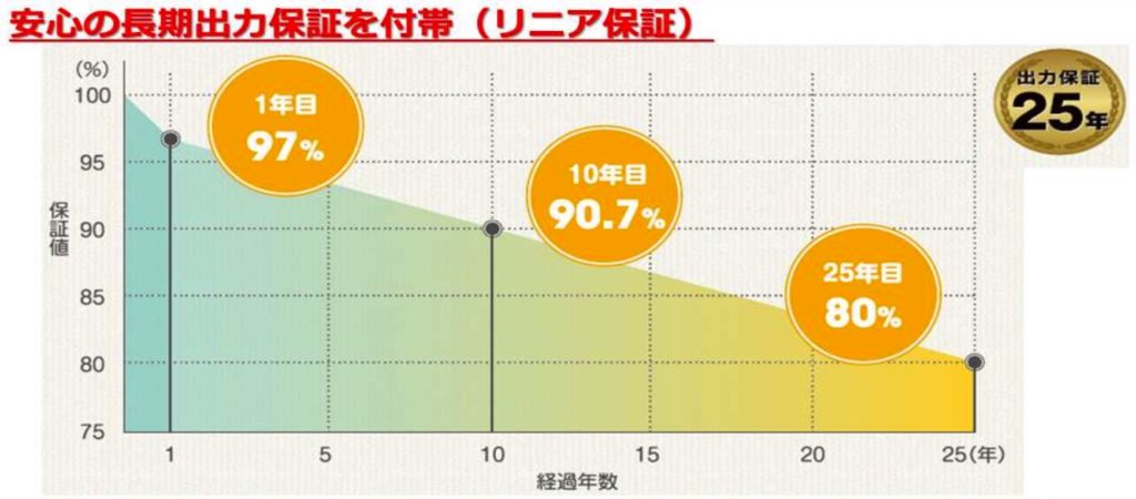その一方で、やはりパネルは消耗品なので出力が落ちてきます。メーカーの出力保証の値は下記の通り。