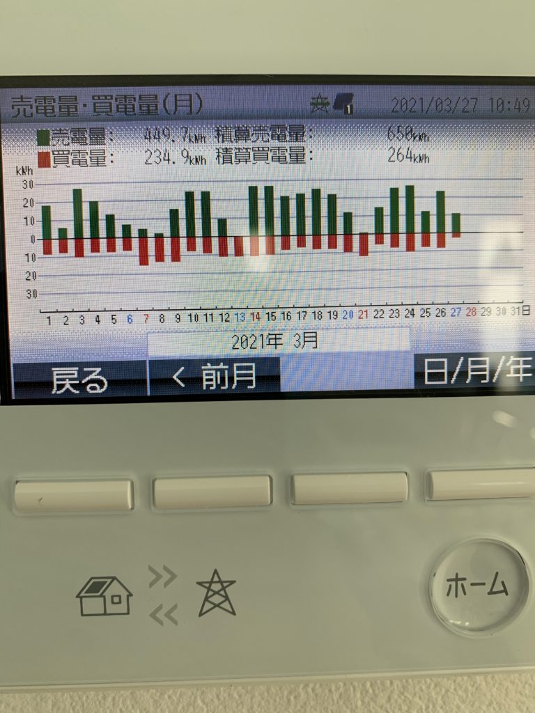 売電量が買電量の倍くらいありますね。電気代はトータルでプラスになってるんじゃないかな…。
